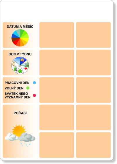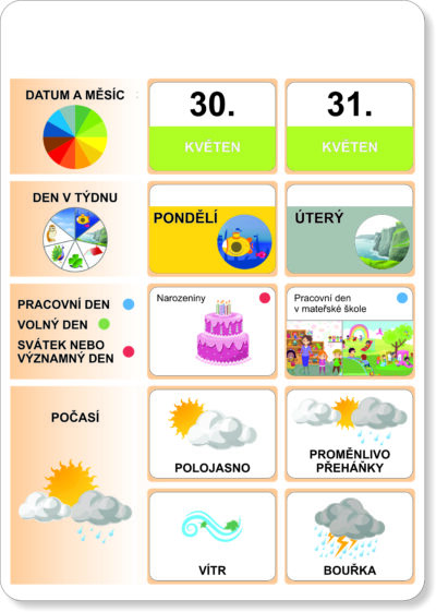 Do kalendáře se pak přikládají každý den malé obrázkové karty – měsíc; den v týdnu; volný den, pracovní den, svátek; počasí. Pomůcka umožňuje vyznačit také datum a označit příslušné dny v týdnu výrazy včera, dnes a zítra. Vedle kalendáře ještě můžete umístit kartu aktuálního ročního období.