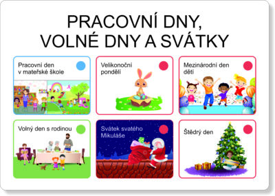 pracovní den v mateřské škole, volný den s rodinou, narozeniny, Den obnovy samostatného českého státu, Nový rok, Svátek svatého Valentýna, Den učitelů, Velikonoce, Velký pátek, Velikonoční pondělí, Den Země, Svátek práce, Den vítězství, Den matek, Mezinárodní den dětí, Den otců, začátek letních prázdnin, Den slovanských věrozvěstů Cyrila a Metoděje, Den upálení mistra Jana Husa, začátek školního roku, Den české státnosti, Den vzniku samostatného československého státu, Halloween, Památka zesnulých, Den boje za svobodu a demokracii a Mezinárodní den studentstva, Svátek svatého Mikuláše, Advent, První adventní neděle, Druhá adventní neděle, Třetí adventní neděle, Čtvrtá adventní neděle, Vánoce, Štědrý den, První svátek vánoční, začátek jara – jarní rovnodennost, začátek léta – letní slunovrat, začátek podzimu – podzimní rovnodennost, začátek zimy – zimní slunovrat